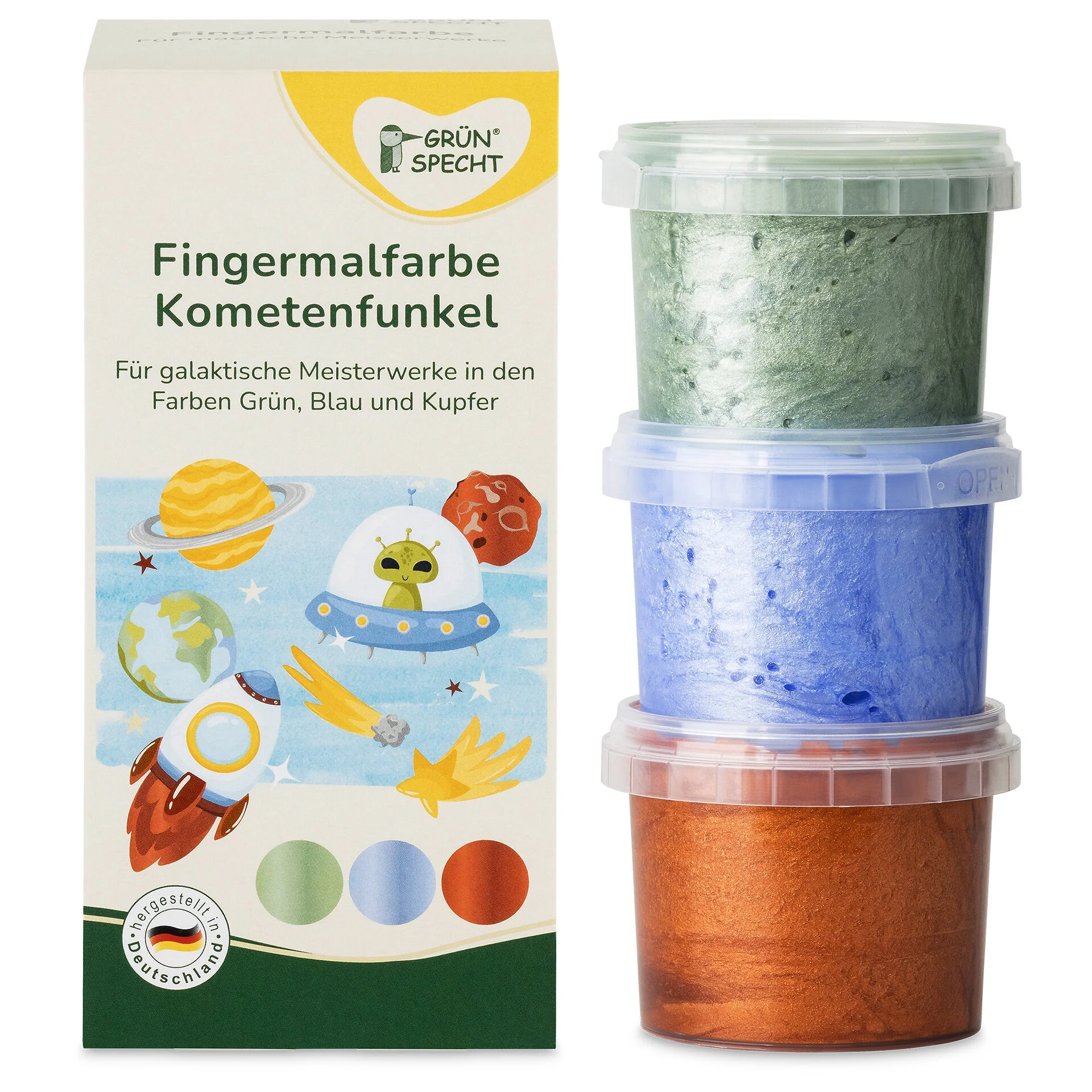 Fingermalfarbe Glitzer rot, grün, gold Kinder entdecken die Welt mit allen Sinnen. Mit den Fingermalfarben Glitzer können sich die Kleinen kreativ austoben, malen und sich ausprobieren. Das Set enthält ergänzende Farben zu unseren klassischen Fingermalfarben – perfekt um die Farbpalette zu erweitern und magische Meisterwerke zu gestalten. Die Farben zeichnen sich durch ihre leichte, zarte Deckkraft aus, wodurch spannende Farbeffekte und sanfte Farbverläufe entstehen. Die Zusammensetzung der Fingermalfarbe berücksichtigt Rohstoffe unterschiedlicher Herkunft, einschließlich nachwachsender Quellen. Dafür verwenden wir pflanzliche Pigmente in Lebensmittelqualität.